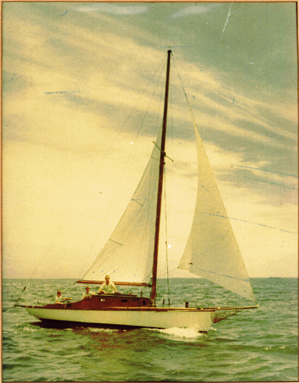 I bought Monsoon in 1963 and began to race it actively with a great crew made up of friends and my two sons. With its 35’ OA rig, she was fast, and being a racer at heart, I always pushed the canvas. She was ready to go for an around the buoys race in October, 1964. My eager crew were juiced up for a win, more so when we stole the start in a light northeast wind. 16 boats trailed us as we rounded the sea buoy off Sangley Pont Naval Air Station. Trident, a 45 foot steel ketch, was hard on our wake as the customary noon wind change to the southeast hit. I looked back at this powerful giant gaining on us, then up at the large genoa we had flying. It should not be flying in 20 knots but if I went for a sail change, Trident would zip right past us as we bobbed along without a headsail.