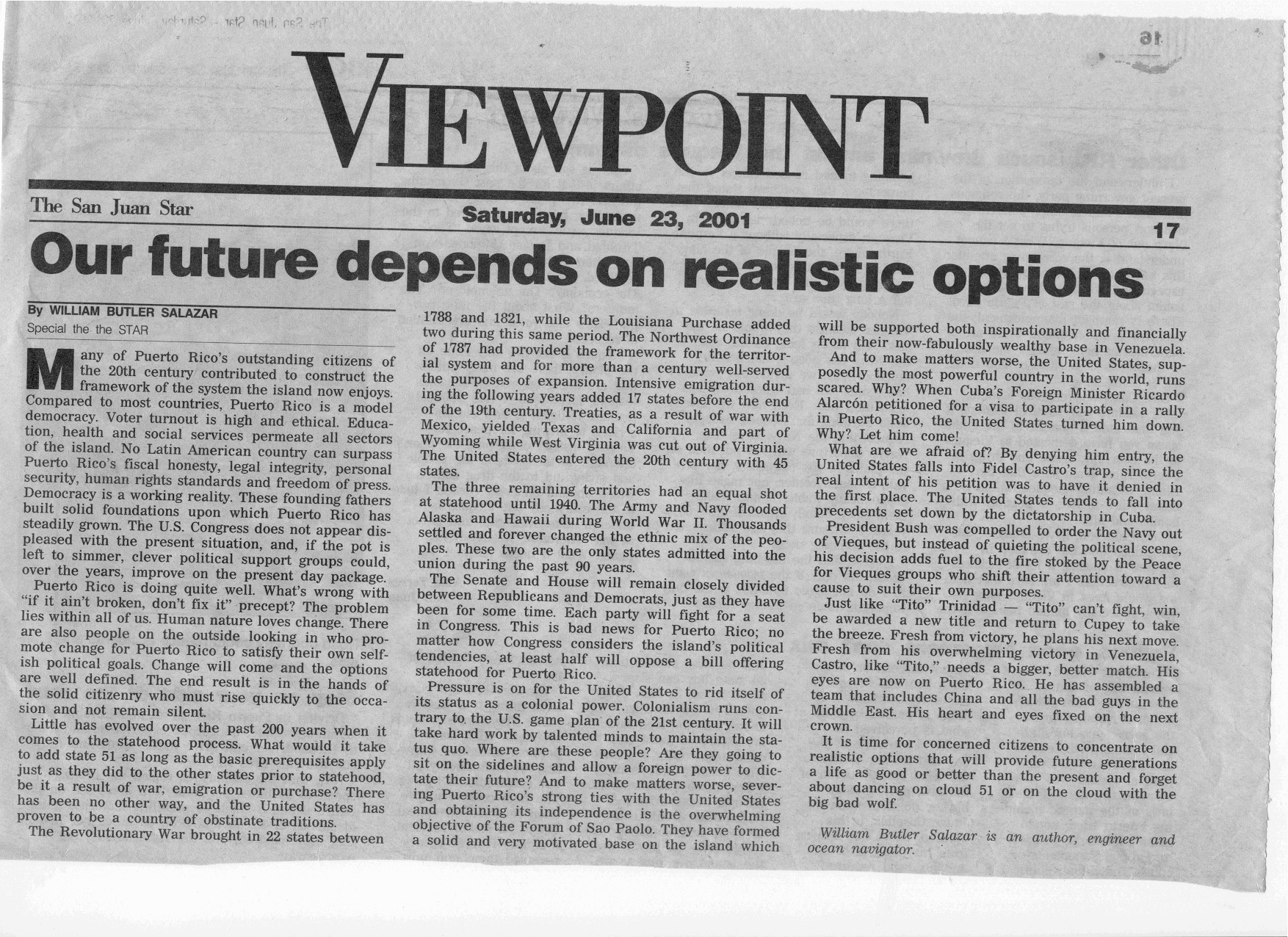 By William Butler Salazar (Published June23, 2001 by the San Juan Star) Many of Puerto Rico’s outstanding citizens of the 20th century contributed to construct the framework of the system that Puerto Rico now enjoys. Compared to most countries in size and density, and to many in Latin America much larger, Puerto Rico is a model in democracy. Voter turnout is high and ethical. Education, health and social services permeate all sectors of the island. No Latin American country can surpass Puerto Rico’s fiscal honesty, legal integrity, personal security, human rights standards and freedom of press. Democracy is a working reality. These founding fathers built solid foundations upon which Puerto Rico has steadily grown. The US Congress appears not displeased with the present situation and, if the pot is left to simmer, clever political support groups could, over the years, improve on the present day package. As rated within the Century 21 world, Puerto Rico is doing quite well. What’s wrong with “if it ain’t broken, don’t change it” precept? The problem lies with all of us. Human nature loves change. There are also people on the outside looking in who promote change for Puerto Rico to satisfy their own selfish political goals. Change will come and the options are well defined. The end result is in the hands of the solid citizenry who must rise quickly to the occasion to seek flowers and not remain silent like the bird’s other wing which received a bullet straight to its heart. Little change has evolved over the past 200 years when it comes to the Statehood Process. Fifty colonies/territories/republics have become states. Five became states in the 20th century. What would it take to add state #51? Not a heck of a lot, as long as it fits the basic prerequisites followed by all other states prior to statehood: be a result of war, migration or purchase. There’s been no other way, and the USA has proven to be a country of obstinate traditions. The War of Revolution brought in 22 states between 1788 and 1821 while the Louisiana Purchase added two during this same period. The Northwest Ordinance of 1787 had provided the framework for the territorial system and for over a century served well the purposes of expansion. Intensive emigration during the following years added 17 states before the end of the 19th century dropped to a close. Treaties as a result of war with Mexico yielded Texas and California and part of Wyoming while W. Virginia was cut out of Virginia. The USA entered the 20th century with 45 states. Oklahoma became a state in 1907, followed by the last two contiguous territories, New Mexico and Arizona, added in 1912. Three territories remained, Alaska, Hawaii and Puerto Rico, all non-contiguous and sparsely populated. These two factors as well as Congress’ uncertainty about the indigenous population in these territories complicated any bid for statehood. Of these three remaining territories, Alaska was the first, in 1916, to introduce a Bill for statehood in Congress. It failed to pass. The three remaining territories had an equal shot at statehood, that is, until 1940. Army and Navy personnel flooded Alaska and Hawaii during World War II. Thousands stayed, settled and forever changed the ethnic mix of the peoples. A 1946 referendum, which yielded 60% of the vote in favor of statehood, led to the formation of the Alaskan Statehood Association where a key player was Bob Bartlett. During 14 years as Alaska’s delegate to Congress he developed bonding friendship with key congressional leaders, a major factor in gaining the needed political support. John Burns, Hawaii’s last delegate to Congress, led the march to statehood, granted on March 16, 1959. These two are the only states admitted into the Union during the past 90 years. Bartlett and Burns united to capitalize on the fact that Hawaii was Republican and Alaska Democratic. They put together a package that put together the needed votes in Congress. Little has changed over the years in the political arena. The Senate and House are now, have been for some time, and prospects are that they will remain closely divided between Republicans and Democrats. Each party will fight for each seat in Congress, bad news for Puerto Rico for no matter how members of Congress considers the Island’s political tendencies, at least half will oppose a Bill offering statehood for Puerto Rico. To have promoted the concept of statehood for Puerto Rico, considering the immense odds against it ever occurring, is an unforgivable political sin detrimental to the preservation and improvement of the standard of living and welfare of the peoples. History has demonstrated repeatedly that most radical changes that have occurred in this world were initiated by small motivated groups who dedicated time, tears, sweat and even their lives to promote their ideas. The silent majority traditionally remains silent and is buried. Where were the statehooders and status-quo’ers carrying USA flags in the parade in New York City? Where were the floats showing off the system that has done wonders for Puerto Rico? Pressure is on the USA to rid itself of its status as a colonial power. Colonialism runs contrary to the US game plan for the 21st. century. The hundred dollar question facing congress is how to honorably divest itself of its major colonial thorn. It will take hard work by talented minds to maintain the status quo. Where are these people? Are they going to sit on the sidelines and allow a foreign power dictate their future? And to make maters worse, the severing of Puerto Rico’s strong ties to the US and obtaining its independence is the overwhelming objective of the Forum of Sao Paolo. They have formed a solid and very motivated base on the island which will be supported both inspirationally and financially from their new fabulously wealthy base in Venezuela. And to make matters worse, the United States of America, #1 toughie in the world, runs 